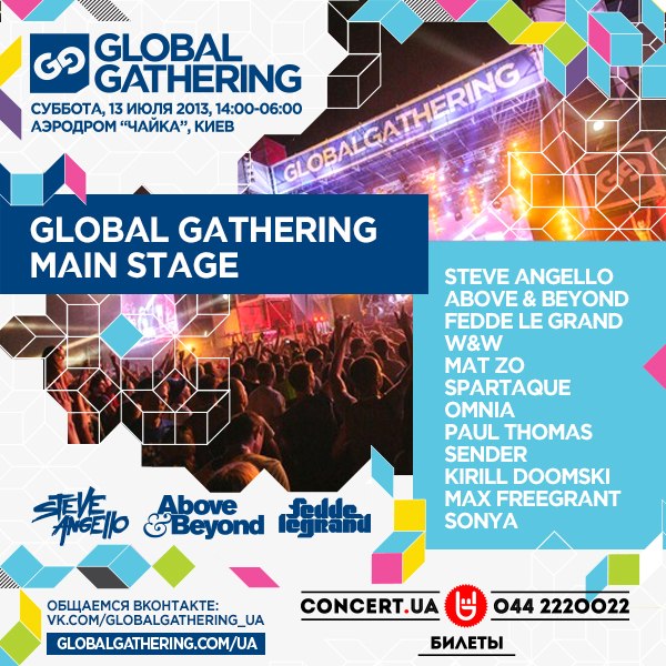 Global Gathering Ukraine 2013 13 июля на аэродроме “Чайка” близ Киева уже седьмой год подряд вас ждет украинская версия международного фестиваля танцевальной музыки – Global Gathering. На четырех сценах крупнейшего летнего опен-эира СНГ c 14:00 до 6 утра для вас сыграют свои сеты: GLOBAL GATHERING MAIN STAGE: STEVE ANGELLO ABOVE & BEYOND FEDDE LE GRAND W&W MAT ZO SPARTAQUE OMNIA PAUL THOMAS SENDER KIRILL DOOMSKI MAX FREEGRANT SONYA DJ FM GODSKITCHEN STAGE: COSMIC GATE FEAT. EMMA HEWITT UMMET OZCAN HEATBEAT TENISHIA KHOMHA JORN VAN DEYNHOVEN ANDREW RAYEL DJ IRA’ DART RAYNE YURA MOONLIGHT TOPDJ CONTEST WINNER THE RED BULL ARENA (Hosted by Boom Boom Room): NINA KRAVIZ ART DEPARTMENT BEN KLOCK GOSHVA & MIKE SPIRIT MAYS & ZLATA KON & JOSEPH RUSTAM & LOLA PALMER SMAILOV & MAKAREN DIZZY & GOYA VELEEV & T.FAIN WESTBOY & GUY RICHARD MALEN, BERESKIN, TAPEBOY 4EZZ PIRATE STATION STAGE: CALYX & TEEBEE BLACK SUN EMPIRE SP:MC CODEBREAKER MC TAPOLSKY VOVKING LIME KID FREE PEOPLE FADEMAN & OLEG K NICKBEE HOT NOIZES FULLCASUAL DOC До 31 мая (включительно) у вас есть возможность приобрести билеты по эксклюзивной цене: Standard – 429 грн., – VIP – 579 грн. http://www.concert.ua/booking/gg-13 Стоимость билетов во всех остальных местах продажи: Standard – 450 грн., VIP – 600 грн. Подробности в официальной группе фестиваля ВКонтакте: http://vk.com/globalgathering_ua