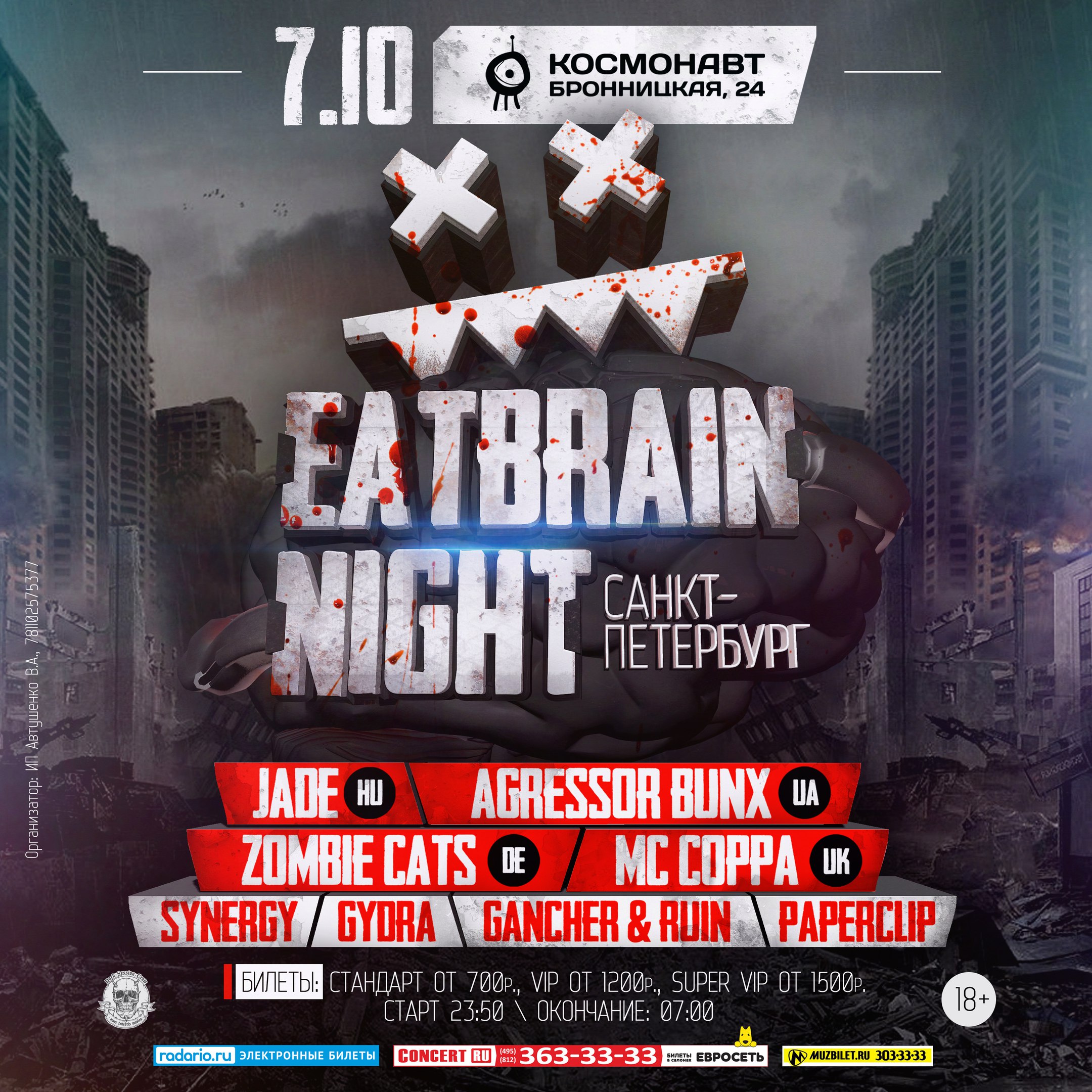 Eatbrain Night, Петербург, 07.10.17 Впервые в Санкт-Петербурге – Eatbrain night! В настоящее время лейбл Eatbrain прочно занял одно из лидирующих мест на drum and bass сцене и, безусловно, является самым успешным neurofunk-лейблом. Каждый релиз на этом лейбле не остается незамеченным публикой. На счету Eatbrain открыто множество новых имен и, наконец, он приезжает в Санкт-Петербург с мощнейшим составом! Eatbrain night пройдет в клубе Космонавт – это одна из самых технически оснащенных площадок в городе. И естественно для любителей neurofunk’a мощнейший звук L-ACOUSTICS, отдельные вип зоны с удобными местами и лучшим видом на сцену. ★JADE (HU) ★ AGRESSOR BUNX (UA) ★ ZOMBIE CATS(DE) ★ MC COPPA(UK) ★ Synergy(ЕКб/CПб) ★ Gydra(МСК/СПб) ★ Gancher & Ruin (СПб) ★ Paperclip (МСК). ► Билеты: concert.ru/Event?ActionID=73517 , radario.ru/events/183424, а также в салонах Евросеть и Связной, в кассе клуба Космонавт. ►Дизайнерские билеты: По телефону (812) 934-21-14, и через сообщения сообществу. ►Официальная встреча: vk.com/eatbrainnight 7 октября, 23:55 Петербург, клуб Космонавт ул. Бронницкая, д. 24, ст.м.Технологический институт eatbrain.ru